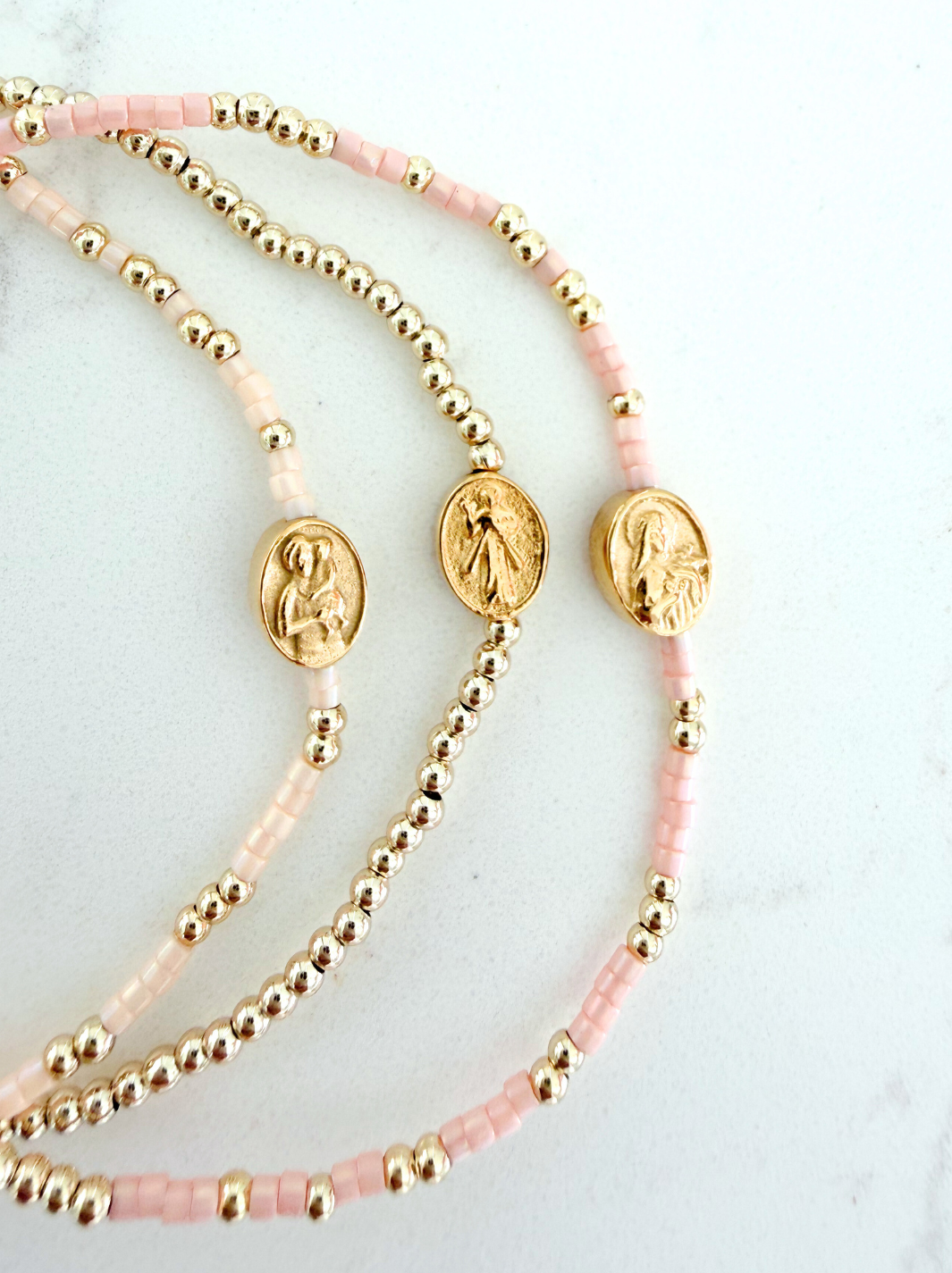 St. Thérèse of Lisieux (Pink) – The saint of the Little Way, whose tender wisdom reminds us that love is found in the small, hidden moments and offered one act at a time.