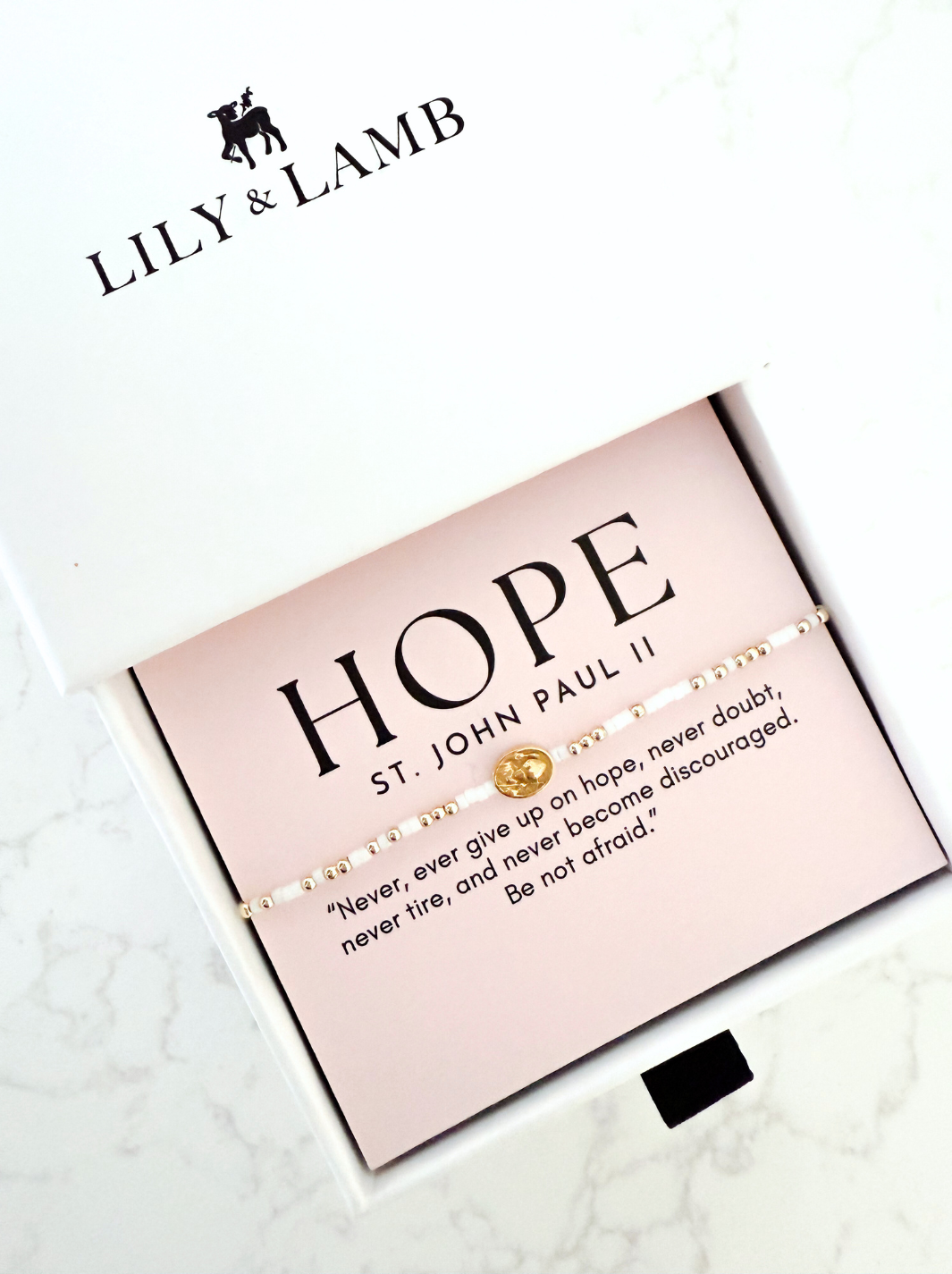 Our St. John Paul II bracelet celebrates a saint who showed the world the power of hope rooted in Christ. With his joyful spirit and unwavering courage, he inspired millions to “Be not afraid” and to trust that God’s love conquers all fear. Designed for modern Catholic women, this bracelet invites you to carry his message of hope, joy, and steadfast faith into your daily life.